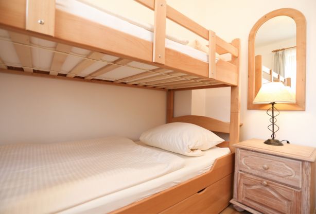 Gemütlicher Wohnraum, schönes Schlafzimmer mit Doppelbett, zweites Schlafzimmer mit Hochbett, Dusche/WC und eine bestückte Kochnische.